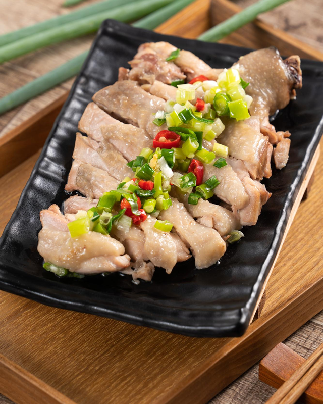將雞腿肉醃製調味後,放入電鍋蒸熟備用;取蔥花及薑末、鹽巴,炒煮後放涼完成蔥油醬,淋到蒸熟後的雞腿肉即可完成。